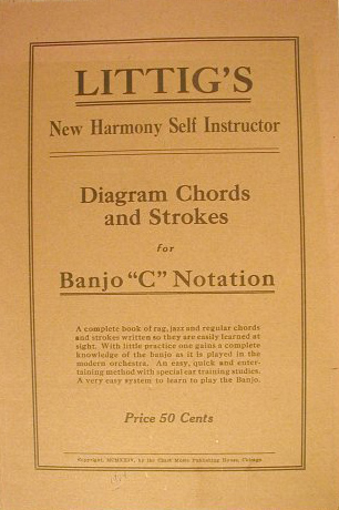 There is also a similarly titled, “Littig’s New Harmony Self Instructor – Diagram Chords and Strokes for Banjo “C” Notation”. I’ve no way of knowing at present whether this is for Plectrum, 5-string, or Tenor banjo: