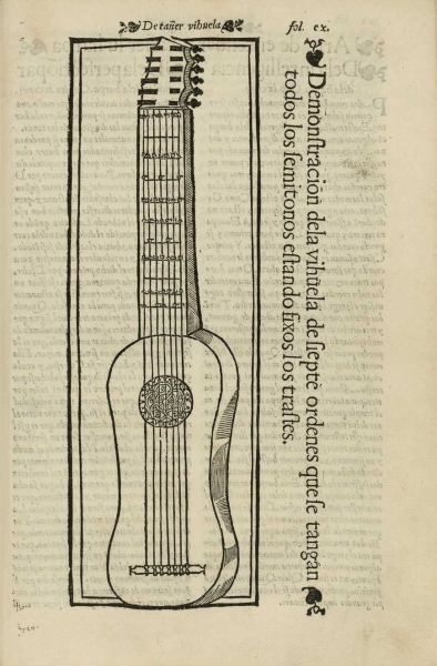 [II] Libro de música de vihuela de mano intitulado El Maestro. Valencia: Francisco Díaz Romano, 1536 – A novel based on Castiglione’s Il Cortigiano – a guide to manners of behaviour, now moved to the Valencian court of the Duke of Calabria. Notable for Milan’s descriptions of his own performances. He never carries a vihuela – one is always given to him – and he never plays solo, always song with vihuela accompaniment.