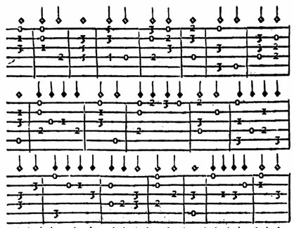 Here is the score in French Tab, taken from Sarge Gerbode’s site. Unfortunately there is a mistake in bar 6, but I have corrected it here: fecitpotentiam